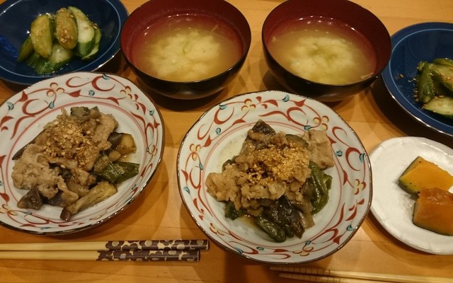 なすと豚肉のみそ炒めがメイン 主菜がしっかり味なので副菜 汁物は