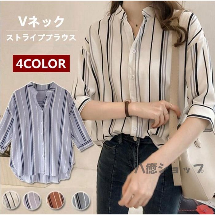 ブラウス ストライプシャツ レディースシャツ Vネック 五分袖 春夏