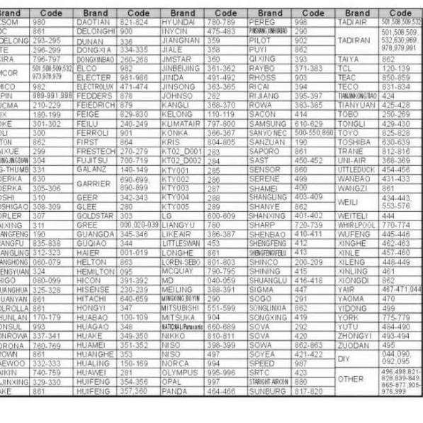 Universal Air Conditioner Remote Control Codes