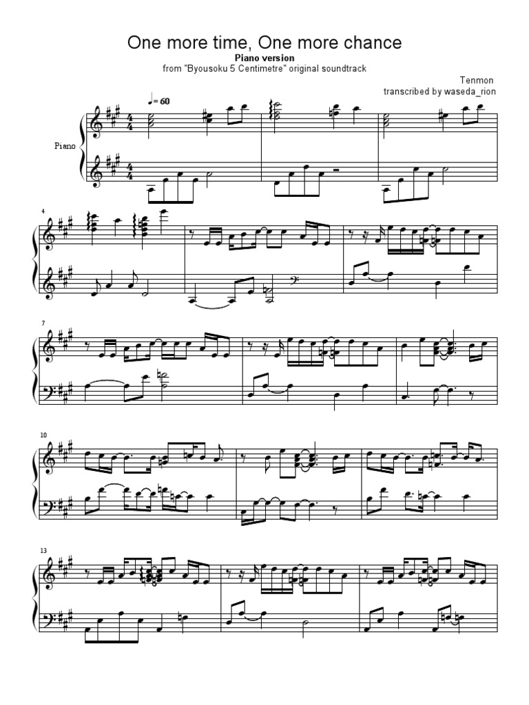 One more time one more chance piano sheet. I transposed it to d key to use as piano accompaniment for an alto c ocarina. Print and download in pdf or midi one more time one more chance 山崎まさよし 作詞 作曲 山崎将義 アカペラ編曲 溝部. One more time one more chance is the ending theme song of the 2007 japanese film 5 centimetres per second. Sheet music for one more time one more chance from 5 centimeters per second 秒速5センチメートル composed by masayoshi yamazaki arranged by anime pianist toshi kun.