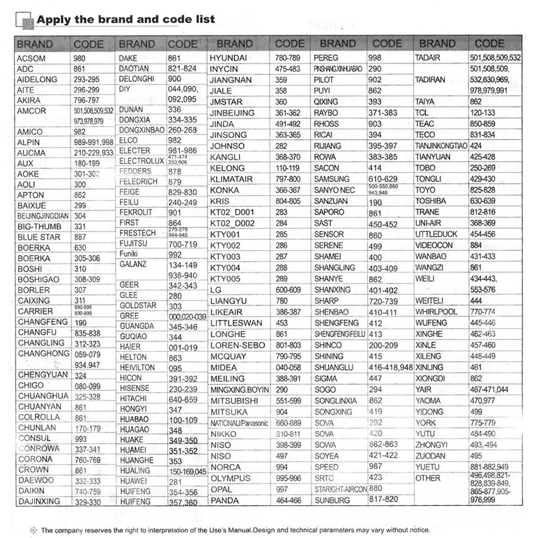 Universal Air Conditioner Remote Control Codes